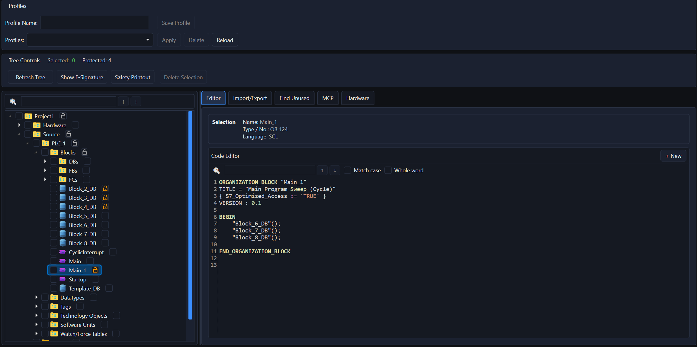 Built-in editor with syntax highlighting for SCL, STL, and other languages. View block details like number, language, and author. Quick navigation with search in project tree. Navigate your project with the hierarchical tree view.
