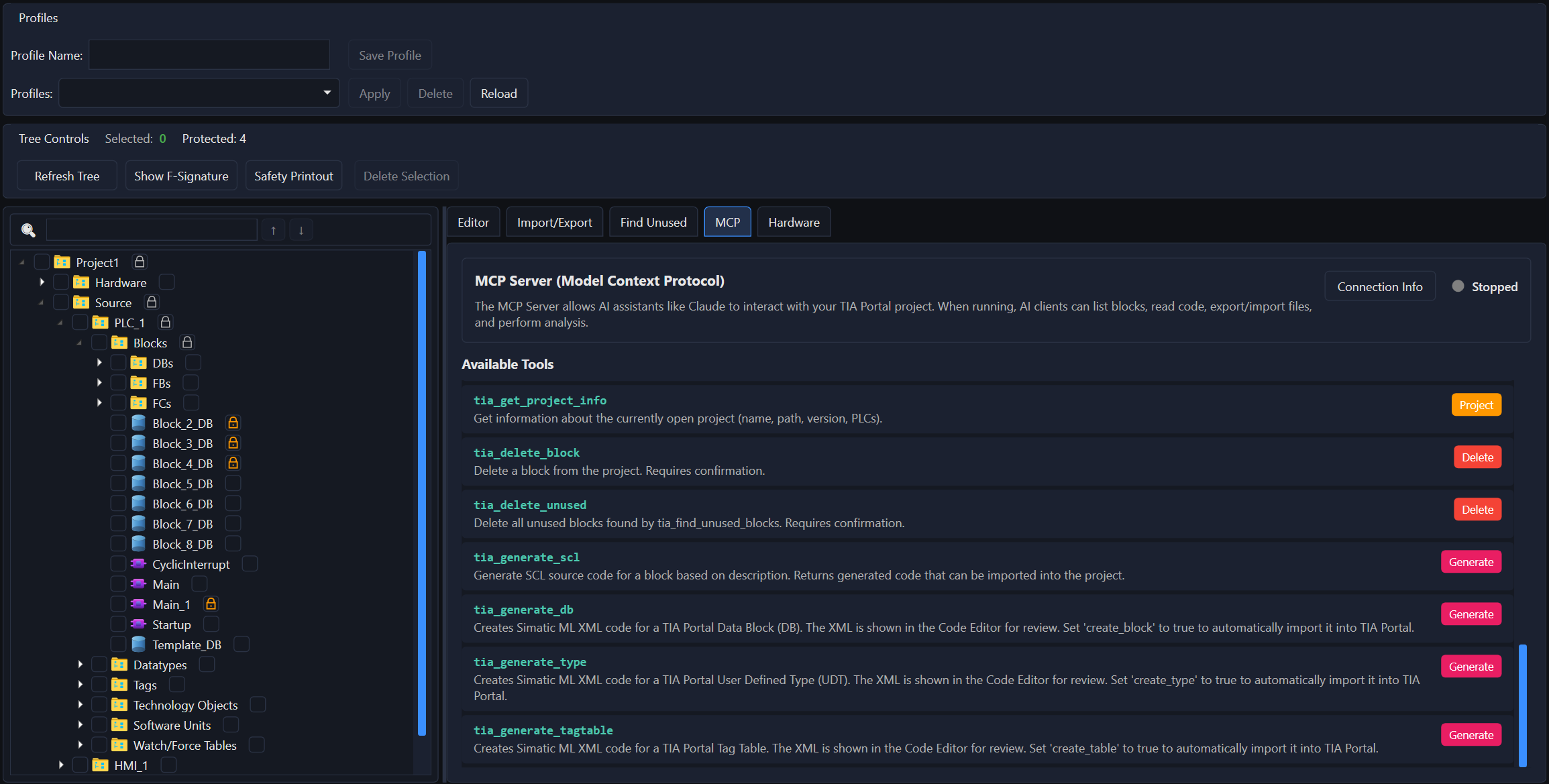 A powerful desktop application for managing Siemens TIA Portal projects. Import, export, compare, and analyze your PLC code with ease. Features AI integration via Model Context Protocol (MCP) for intelligent automation.